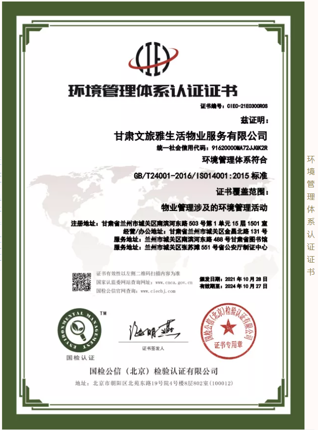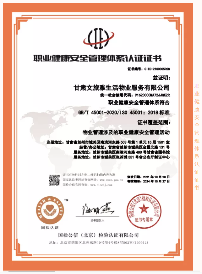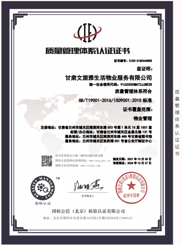2021年,甘肃文旅雅生活物业服务有限公司认真贯彻落实习近平新时代中国特色社会主义思想,坚决落实集团公司各项决策部署。按照集团公司高质量发展要求,结合自身发展需要,公司于9月份正式启动3A体系认证工作,经过权威认证机构对公司信用管理、制度建设、管理体系等方面综合评估,10月底公司顺利通过3A体系认证,使得公司在管理水平、制度建设方面有了进一步完善及提升,增强了公司核心竞争力和品牌影响力,为公司高质量发展奠定了坚实的基础。