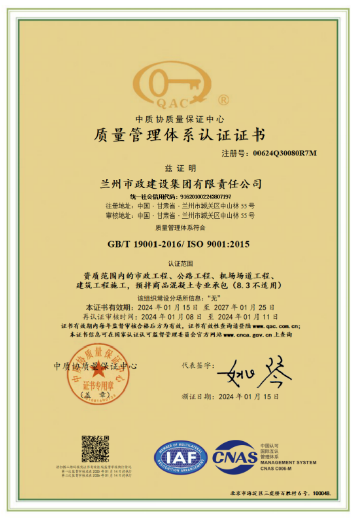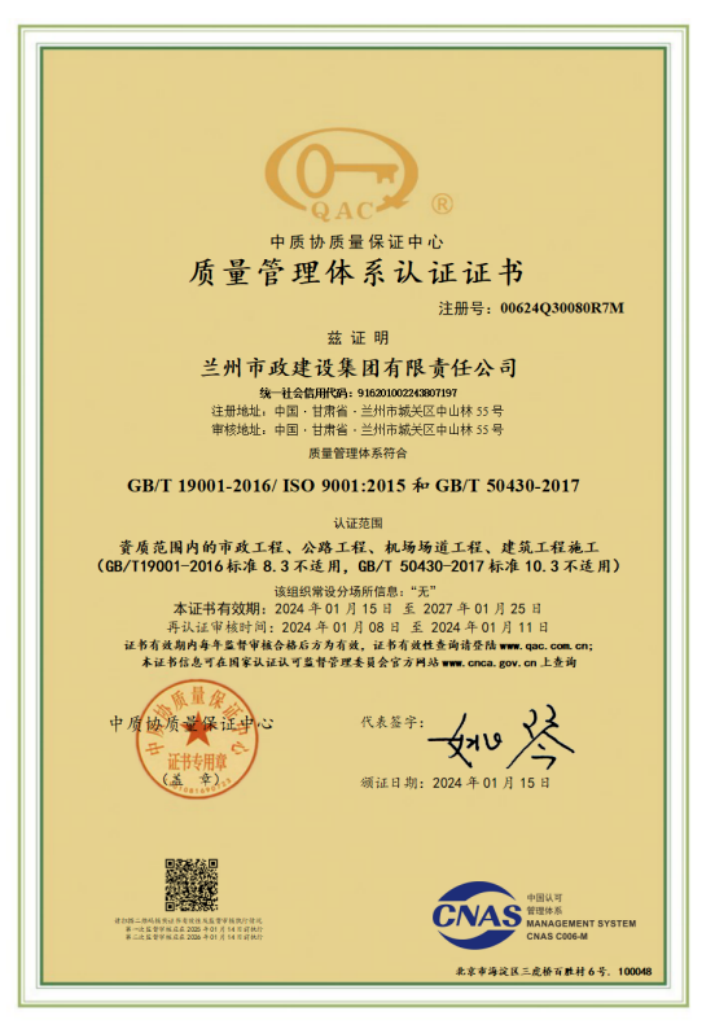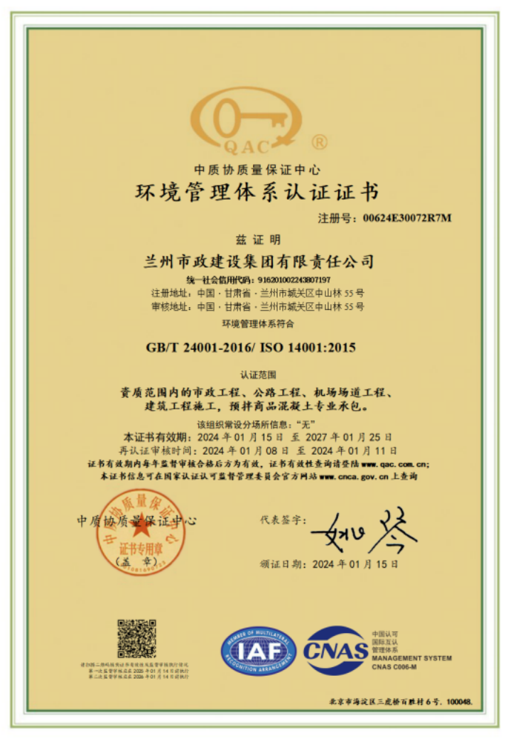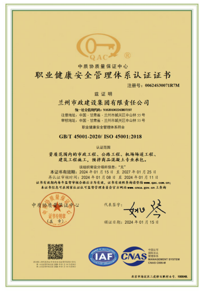 1月23日,甘肃文旅集团旗下子公司兰州市政建设集团顺利通过ISO9001质量管理体系、ISO14001环境管理体系、ISO45001职业健康安全管理体系再认证审核,兰州市政建设集团已连续27年通过ISO综合管理体系认证。