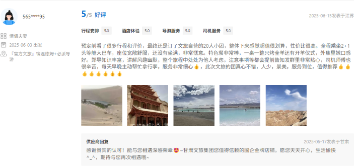 文旅国旅深度整合甘青两地的经典与小众旅游资源,精心打造、上线行程丰富、体验舒适产品的同时南京运营中心紧密围绕游客核心需求,协同配备金牌工作人员随团提供专业讲解与服务,获得广泛好评。平台数据显示,近半年以来,其携程店铺订单量同比增长超过40%,订单完成率高达98.5%,展现出高度的市场认可与出色的运营效能。用户口碑方面,店铺好评率持续稳步提升,目前已达4.9分,累计精选好评超千条,“质量可信、服务可依”的品牌形象日益凸显。