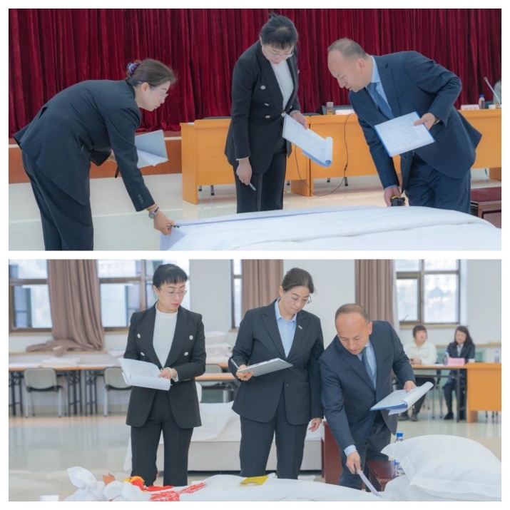 评委们认真检查选手做床完成情况,从铺床准备、操作规范等方面进行综合评判。