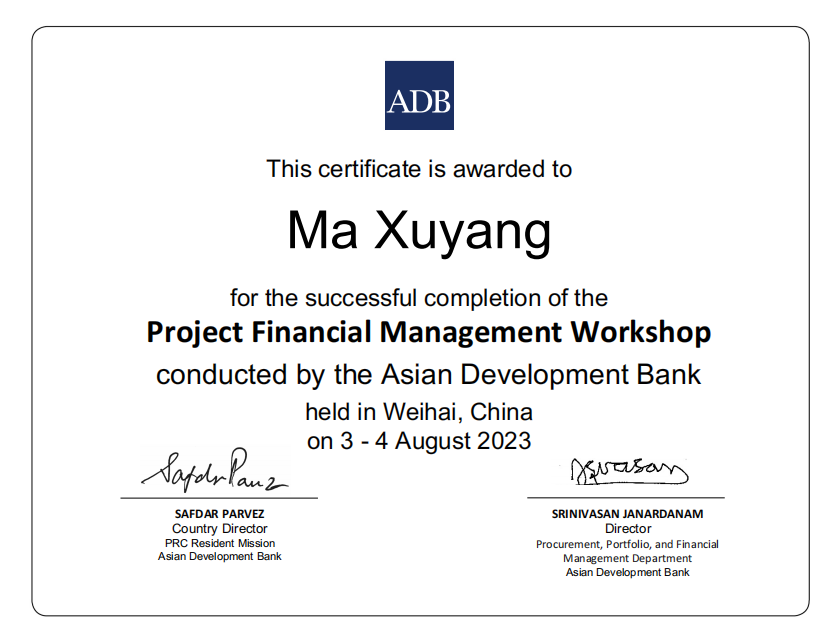 此次培训重点对亚行采购政策、合同管理与合同计划、亚行财务尽职分析要求、项目会计核算、项目财务报表、项目审计等主题进行授课。通过演讲、案例研究、小组讨论、结业测试及经验丰富的执行机构分享经验等方式使参训人员加深了解亚行贷款采购、财务政策/规定并拓展实践知识。甘肃文旅集团国际金融组织贷款项目管理办公室一名同志代表亚行贷款甘肃环境可持续乡村振兴与发展项目作了大会交流发言,分享了项目管理工作中的经验和关注点。培训授课结束,三名参训人员获得了结业证书。